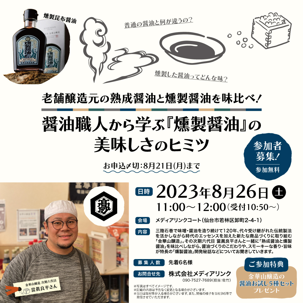 三陸石巻で味噌・醤油を造り続けて120年、代々受け継がれた伝統製法を活かしながら時代のエッセンスを加えた新たな商品づくりに取り組む「金華山醸造」。その次期六代目 當眞良平さんと一緒に「熟成醤油と燻製醤油」を味比べしながら、醤油づくりのこだわりや、スモーキーな香り・旨味が特長の「燻製醤油」開発秘話などについてお聞きしていきます。
