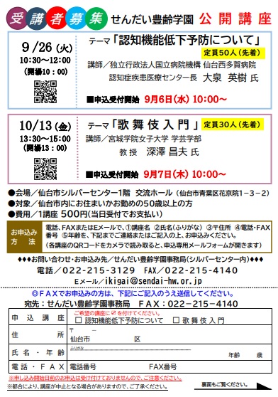 【申込み・問合せ先】せんだい豊齢学園事務局(シルバーセンター内)