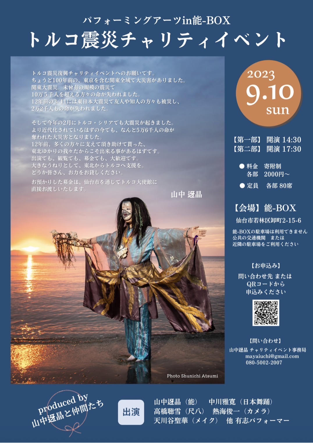 ちょうど100年前の今日、 東京を含む関東全域で大災害がありました。関東大震災。未曾有の規模の震災で10万5千人を 超える方々の命が失われました。 12年前の3/11、東日本大震災では 友人や知人の方々も被災し、2万2千人もの命が失われました。そして今年の2月に、トルコでも大震災が起きました。 より近代化されているはずの今でも、なんと5万6千人の命が奪われた大災害となりました。12年前、多くの方々に支えて頂き 助けて貰った、東北ゆかりの我々だからこそ 出来る事があるはずです。この度、チャリティのイベントを企画しました。出演でも、観覧でも、募金でも、大歓迎です。 大きなうねりとして、東北からトルコへ支援を。 どうか皆さん、お力をお貸しください。