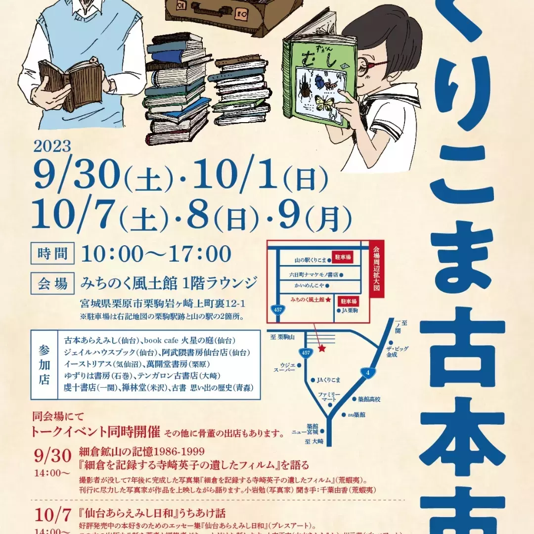 宮城県内外から12店舗の古本屋さんが集まり、大規模な古本市を開催します。懐かしい本や探していた本に出会う機会になることでしょう。併催イベントととして、栗駒六日町通り商店街でも古本にまつわる企画があります。開催日は、9月30日.10月1、7.8.9日の五日間です。皆様のご来場をお待ちしています。