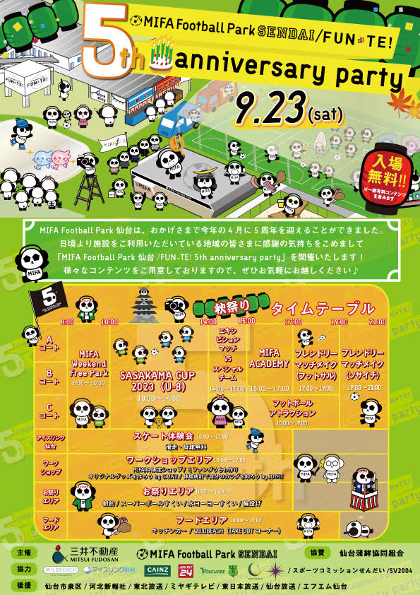 音楽とフットボールによるコミュニケーションの創造をコンセプトとした新しいフットボールパーク。2023年4月に5周年を迎え日頃より施設をご利用いただいているMIFA Football Park 仙台の会員さまや地域住民の皆さまに感謝の気持ちを込めまして、9月23日(土)に「MIFA Football Park 仙台 / FUN-TE! 5th anniversary party」を開催いたします!フットボールコンテンツ、お祭りエリア、ワークショップエリアなど、小さなお子様から大人の方々まで、1日を通してお楽しみいただけるイベントとなっております