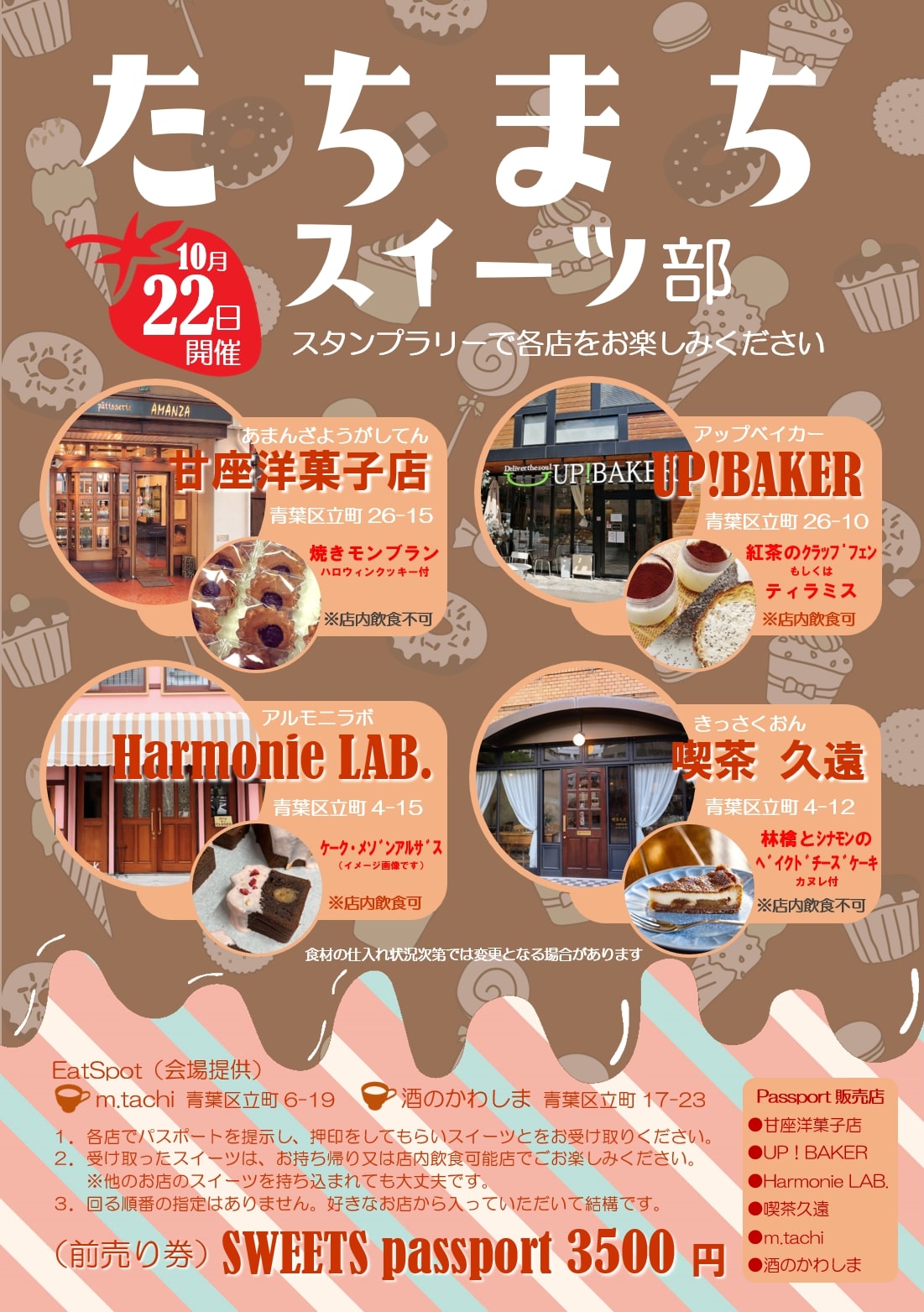 立町には料理とお酒が美味しいお店が点在していますが、近年は魅力的なスイーツのお店も増えて来ました。ならば!多くの方々に知っていただきたく『立町スイーツ部』を立ち上げ、スタンプラリー的なイベントを開催することにしました。詳細は下記の通りですので、是非ご参加下さい!!