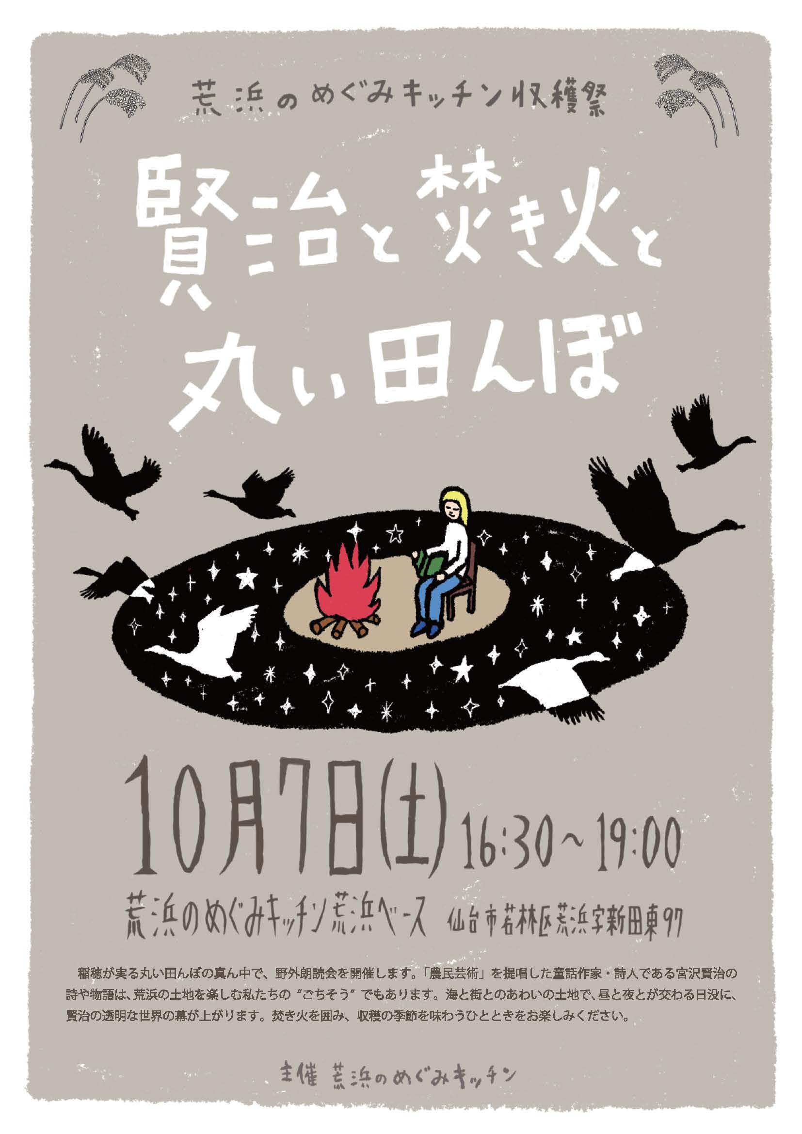仙台市若林区荒浜にある丸い田んぼを舞台に、宮沢賢治作品の朗読会を開催します。仙台市東部沿岸地域の広大な農地の一画で、火を囲み焚火料理も体験・食しながら、この土地が持つ本来の"めぐみ"を五感で味わい、お楽しみください。