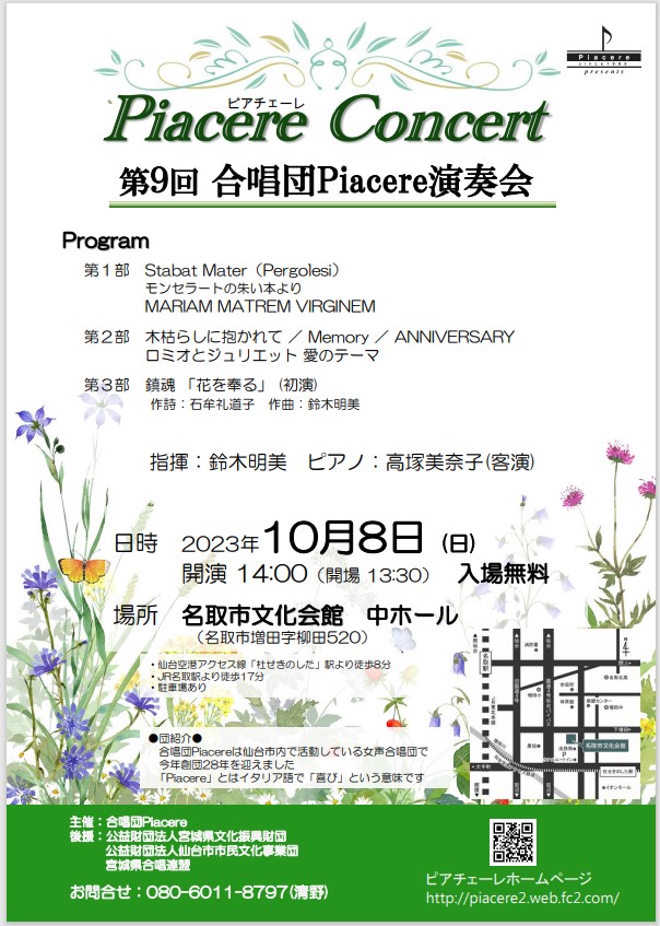 仙台市で活動する合唱団Piacere(ピアチェーレ)の第9回演奏会。PergolesiのStabat Materやロミオとジュリエット 愛のテーマ、団の指導者作曲作品である鎮魂「花を奉る」など幅広いジャンルの曲を演奏します。すてきな曲たちとの出会いに、ぜひお越しください。