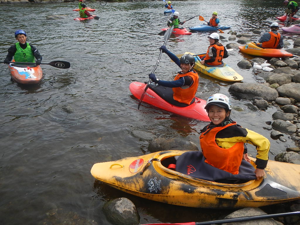 川の中の流れ、瀞とに設定したゲートを通過し、自転車タイヤにパドルをくぐし、回転セッションでは転覆復元するロールでボーナス得点も。年齢的ハンディーを考慮しつつ、早く、正確さを点数換算する面白くも真剣なレースなんです。