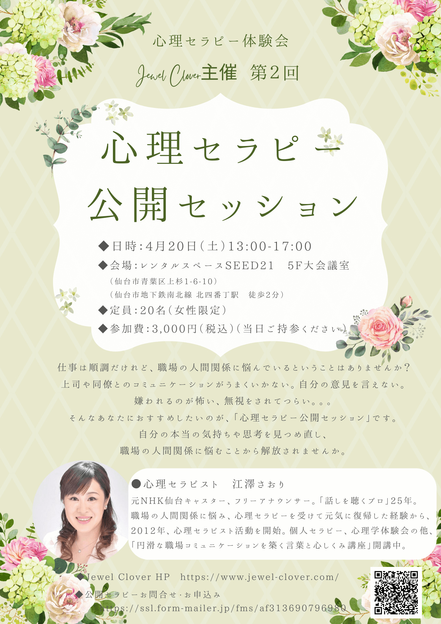 こんにちは。心理カウンセリング・心理セラピールームJewelClover代表セラピスト 心理セラピストの江澤さおりです。