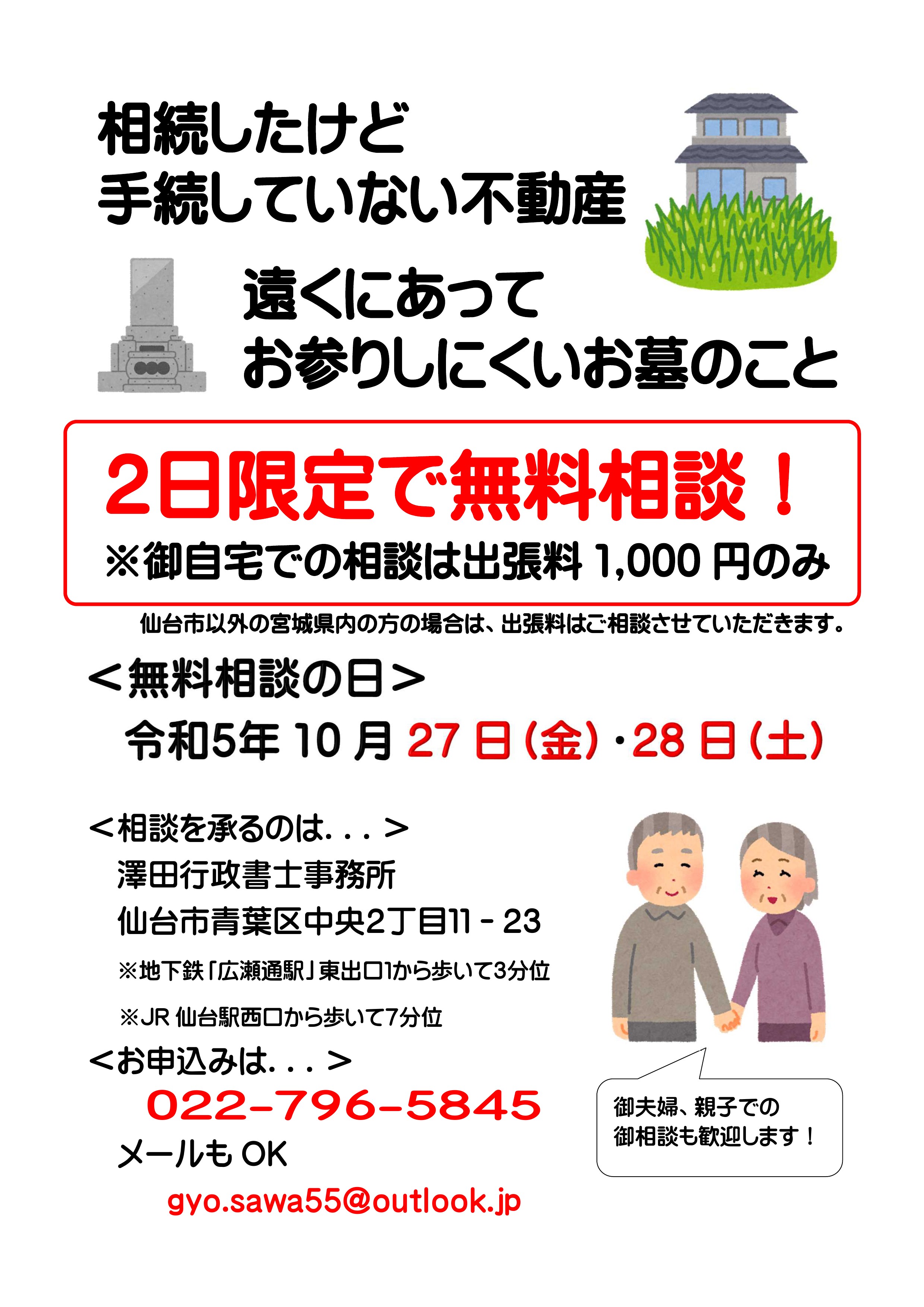 ※仙台市近郊より遠い宮城県在住の方の場合には、相談日を改めて1万円を上限に伺います。