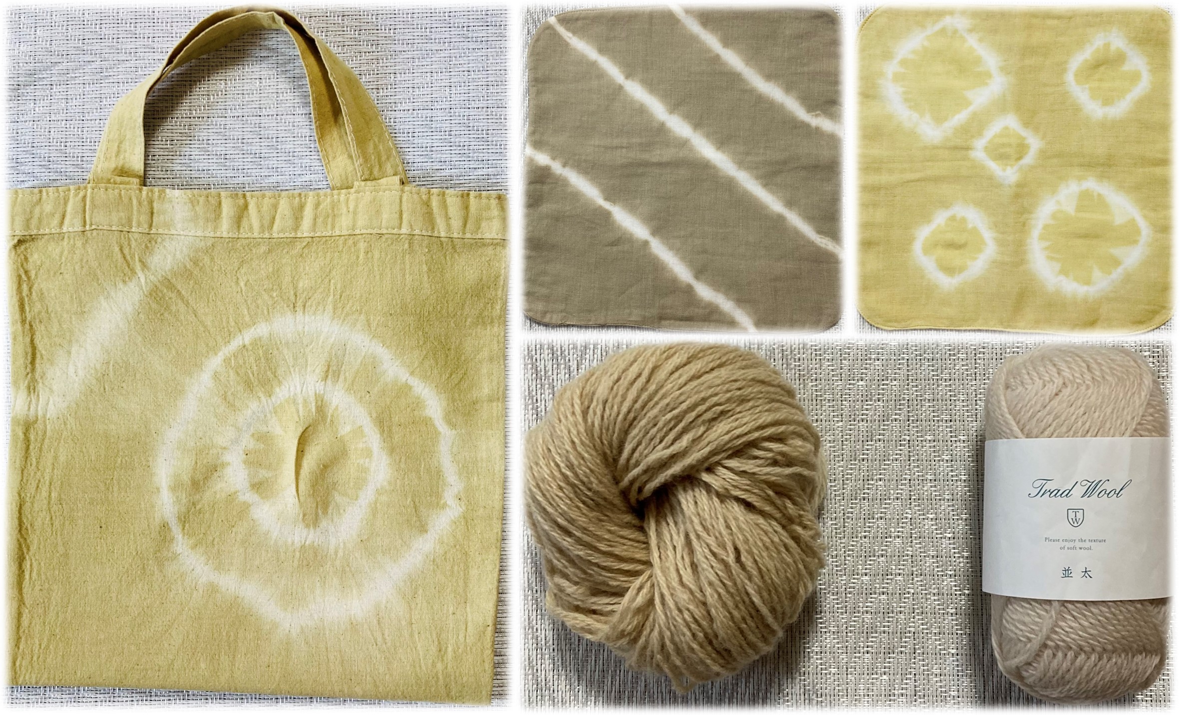 ハンカチや手提げ、ストールなど、普段使えるものから毛糸や生地も染められますよ♪