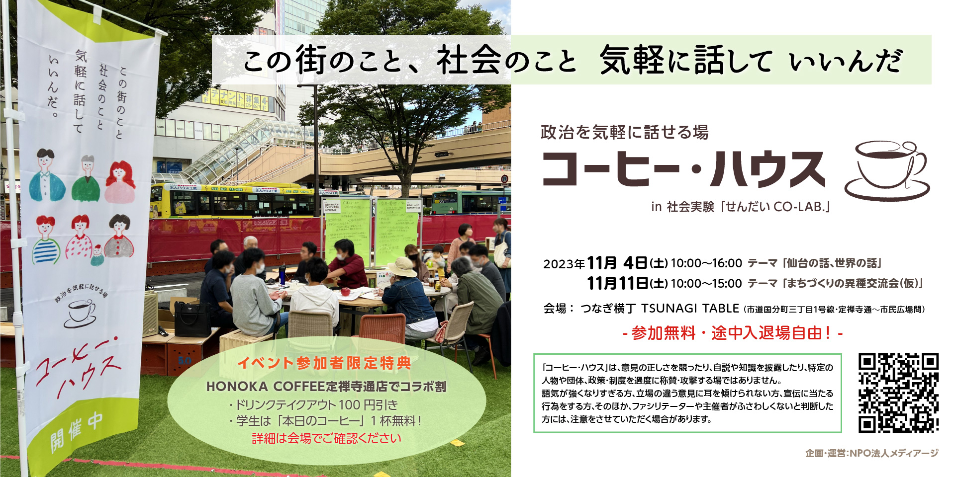 昨年、青葉通りの社会実験でも実施した、政治を気軽に話せるイベント「コーヒー・ハウス」の屋外出張版を、今年も開催できることになりました!