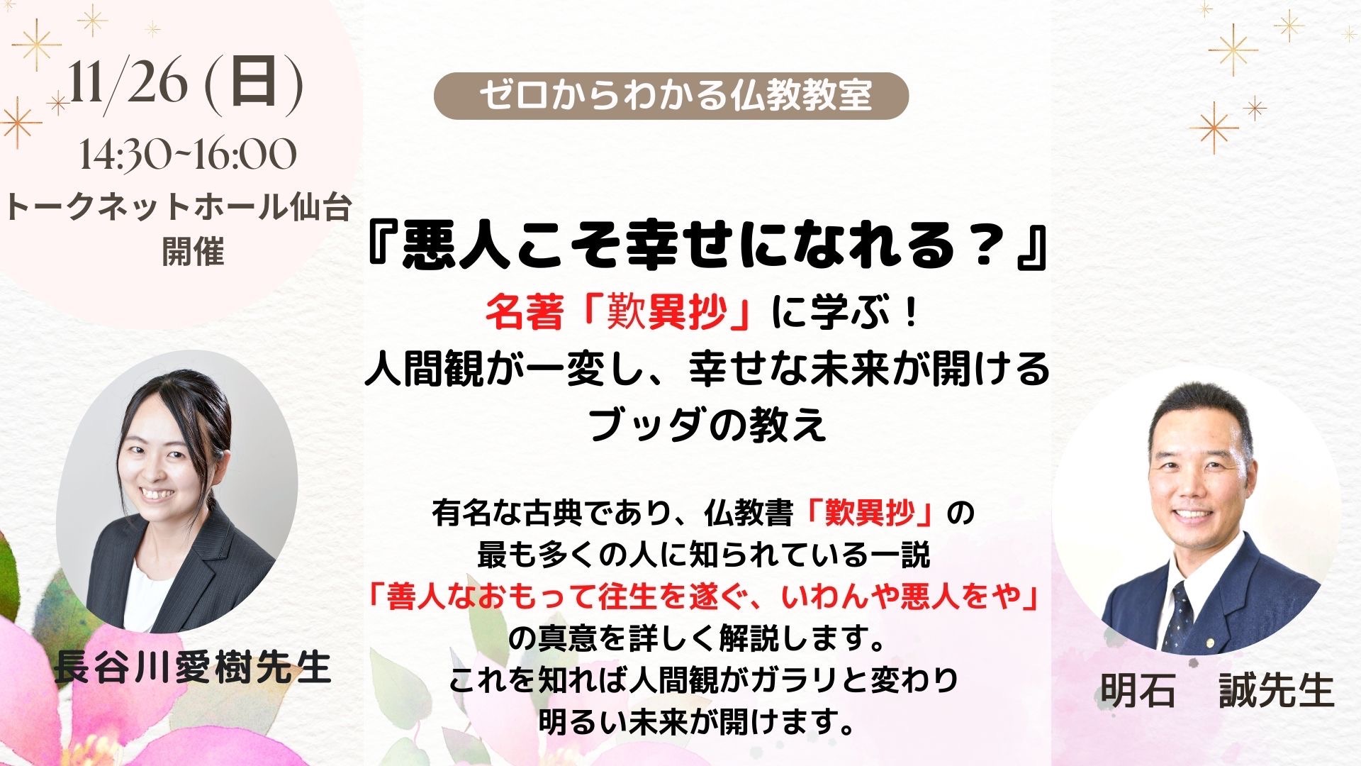 ”えっ、悪人が?”と戸惑う人が多いでしょう。一体、悪人とはどんな人のことを指して言われているのか。有名な古典であり、仏教書「歎異抄」の最も多くの人に知られている一説、「善人なおもって往生を遂ぐ、いわんや悪人をや」の真意を詳しく解説します。これを知れば人間観がガラリと変わり、明るい未来が開けます。