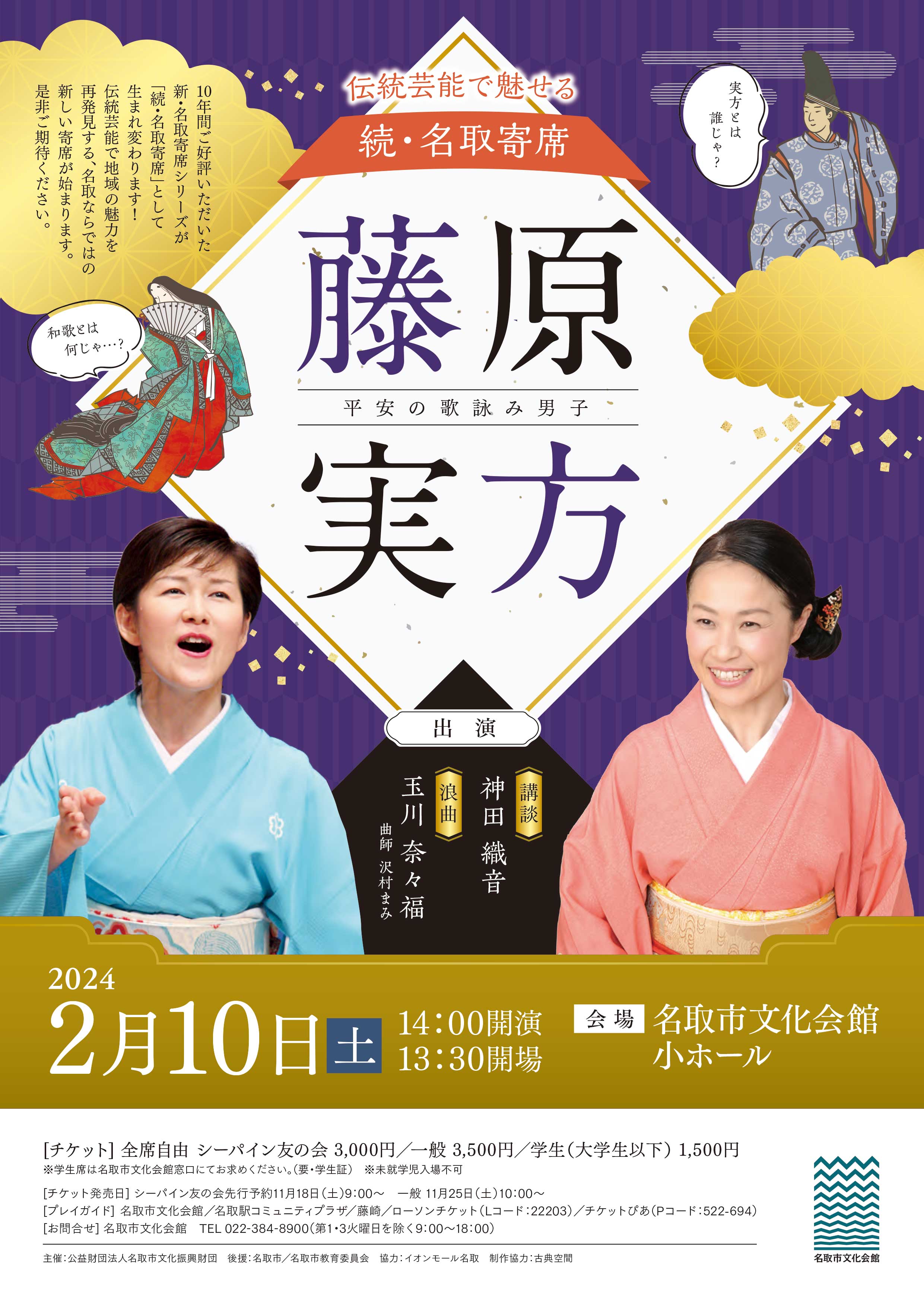 10年間ご好評いただいた新・名取寄席シリーズが「続・名取寄席」として生まれ変わります!今年は講談と浪曲で平安時代の歌人、藤原実方と和歌の魅力を紐解きます。