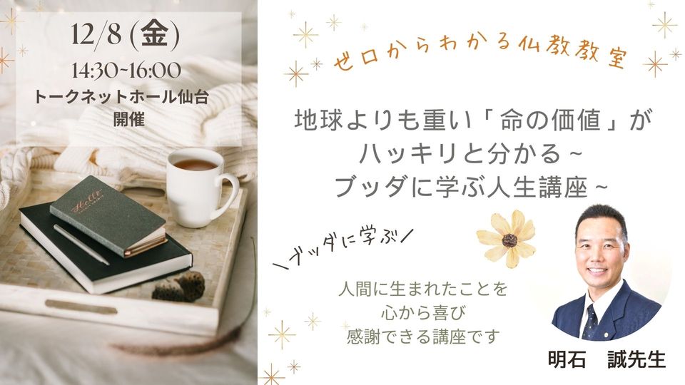 人命軽視の殺人事件また自ら命を絶つ人も絶えません。「なぜ自殺(人を殺して)はいけないのか?」「なぜ人名は地球よりも重いのか?」哲学者もお手上げでした。古今東西、名答が聞けない中、2600年前、仏教を説かれたブッダはこの問いにハッキリ答えられました。人間に生まれたことを心から喜び感謝できる講座です。