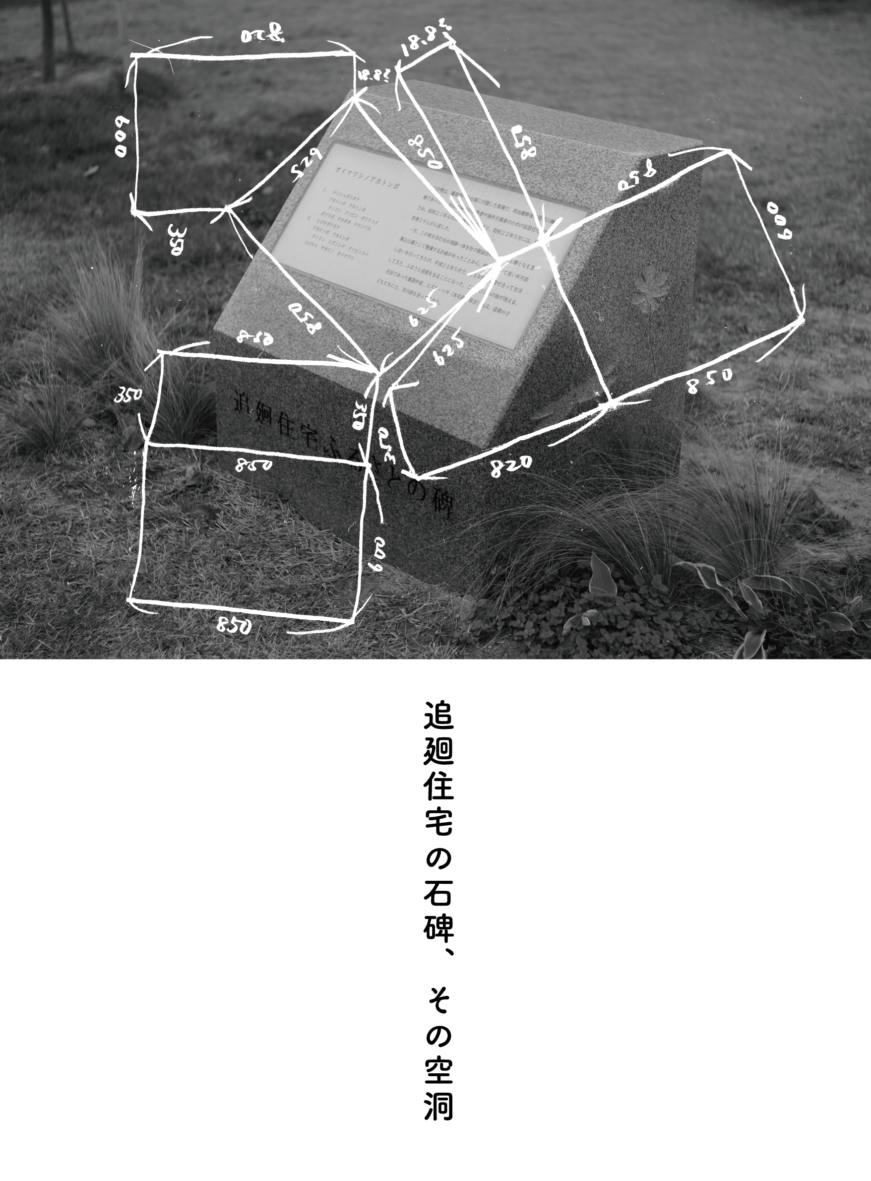 その一角に建つ石碑にまとめられた記述と、そこには記されることのなかった数々の言葉、そして本展で佐々が表す架空のストーリー。それらを目の当たりにするとき、確かにそこに存在していた町の歴史と人間味のある生活や現実、また公園の未来も感じさせられるでしょう。