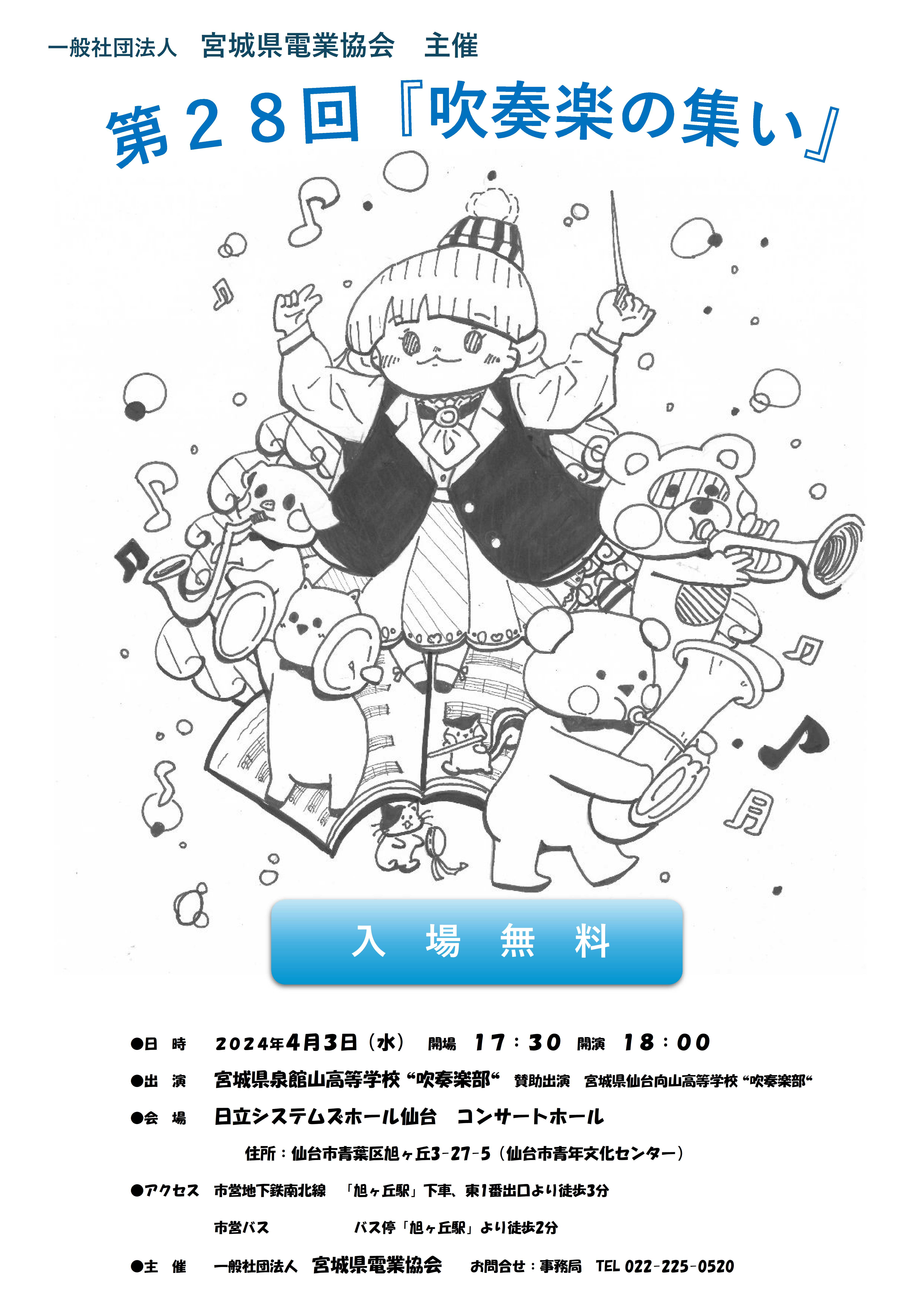 (主催者「(一社)宮城県電業協会」は、電気設備工事を社業とする企業40社あまりで構成されている一般社団法人です。当協会では、毎年、文化事業の一環として『吹奏楽の集い』を企画・開催しております。)