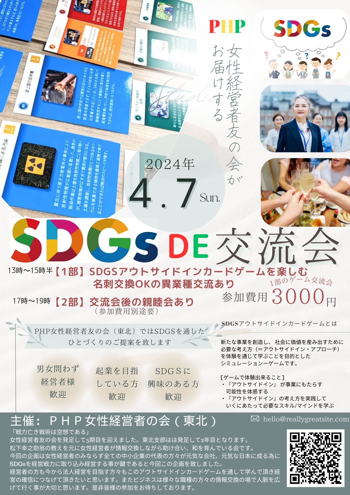 第一部→「SDGsアウトサイドインカードゲーム」ファシリテーターをお呼びして開催致します。この時間内は、名刺交換・連絡先交換自由ですので、交流の場としてもお楽しみ頂けます。また、PHP女性経営者友の会の活動内容もお伝え致します。