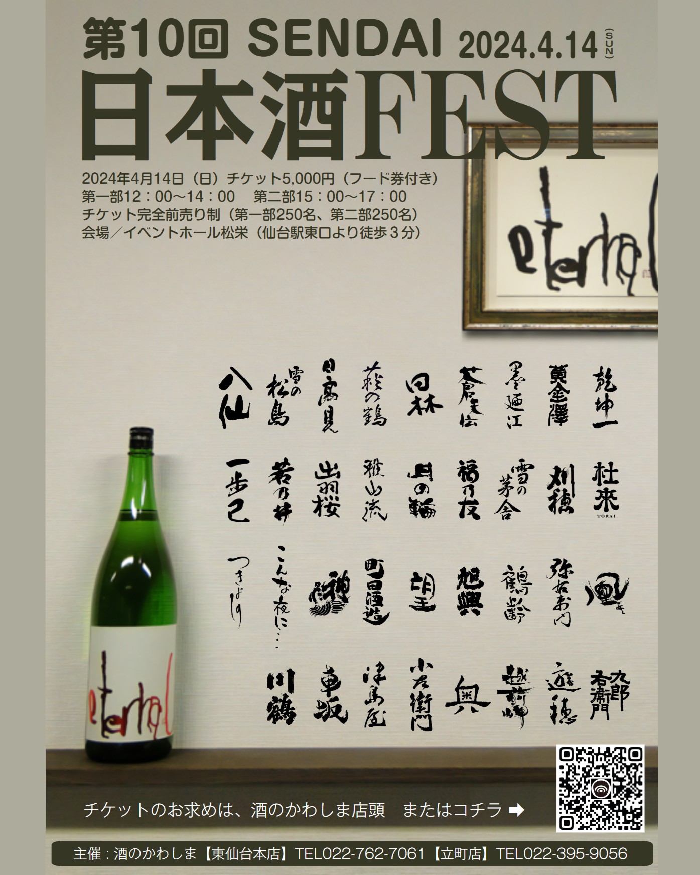「第10回仙台日本酒フェスト」開催が決まりました。仙台日本酒フェストは「酒のかわしま」で取扱いする全国各地の蔵元が仙台に集結。約150種類の日本酒が出品され、それぞれの蔵元がブースで自慢のお酒をおすすめいたします。酒造りへのこだわりや想いを聞きながら季節の日本酒をお楽しみください。全てを試飲していただけますので是非自分好みの一本に出会ってください!