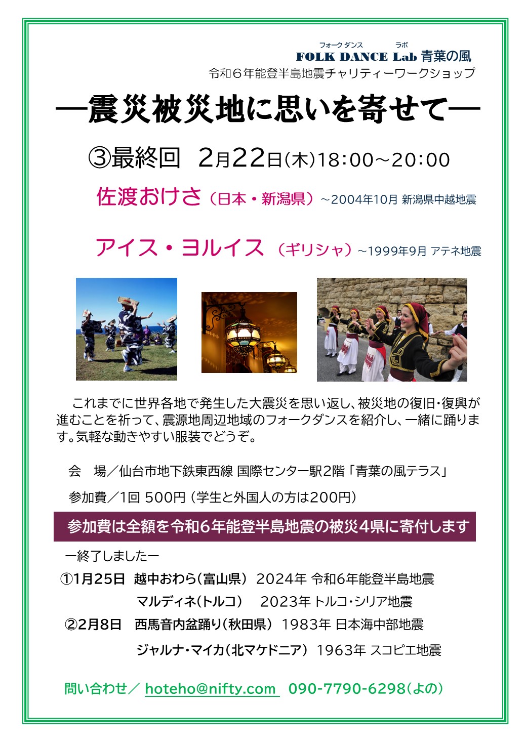 能登半島地震チャリティー/震災被災地に思いを寄せて〜被災地周辺のフォークダンスを踊ろう?佐渡おけさ(新潟県)とアイス・ヨルイス(ギリシャ)