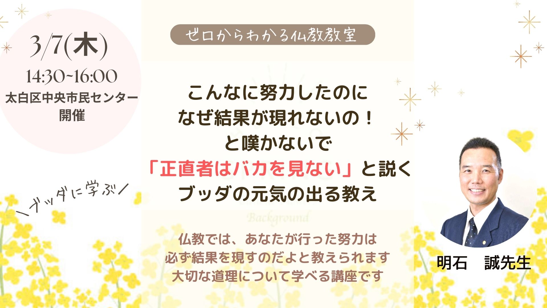 「正直者は馬鹿を見る」と言われますが、仏教では、あなたが行った努力は必ず結果を現すのだよ、と教えられます。しかし、大事なことが分かっていない為に、人によってはヤケを起こして努力をしなくなってしまうのでしょう。その大事なこととは何か。知らなかったでは済まされない、大切な道理について学べる講座です。