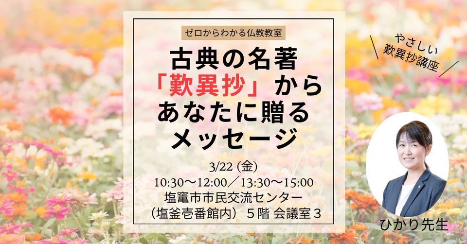 現代の言葉でわかりやすく、お話します。その内容がわかれば、あなたの人生の一瞬一瞬が輝きだします!今回は、名著『歎異抄』の内容を、グッと身近に感じられるよう、以下の6つのテーマの中から、お話します。 ?元気が出る歎異抄