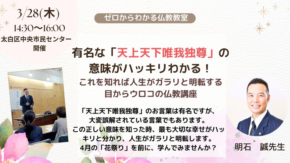 約2600年前の4月8日、ルンビニー園でお生まれになられたお釈迦様、 ご生誕のエピソードをご存知でしょうか?「花祭り」は、今もなされる誕生を祝う行事です。 ご生誕の際、仰言ったといわれる「天上天下唯我独尊」のお言葉は有名ですが、 大変誤解されている言葉でもあります。 この正しい意味を知った時、最も大切な幸せがハッキリと分かり、 人生がガラリと明転します。4月の「花祭り」を前に、目からウロコの仏教講座を学んでみませんか?