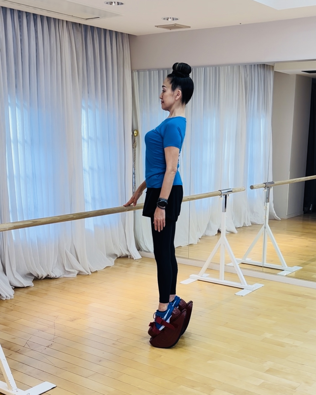 船底のようにラウンドした専用のシューズを使用し、足底、骨盤、背骨にかけて全身をストレッチすることにより、