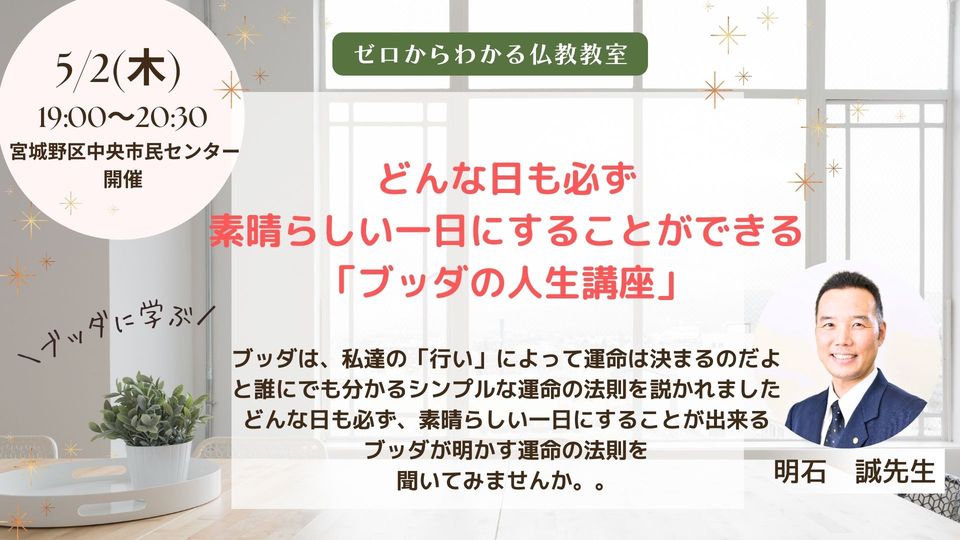 厄年、大殺界の時期にはよくないことが起きると信じている人が多くあります。ところが、ブッダは、あらかじめ、よい日、悪い日が決まっているのではなく、私達の「行い」によって運命は決まるのだよ、と誰にでも分かるシンプルな運命の法則を説かれました。どんな日も必ず、素晴らしい一日にすることが出来る、ブッダが明かす運命の法則を聞いてみませんか。