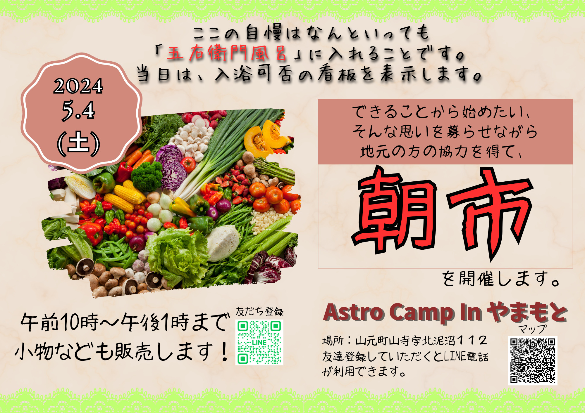 2024年5月4日に、山元町のキャンプ場で「朝市」が開催される。