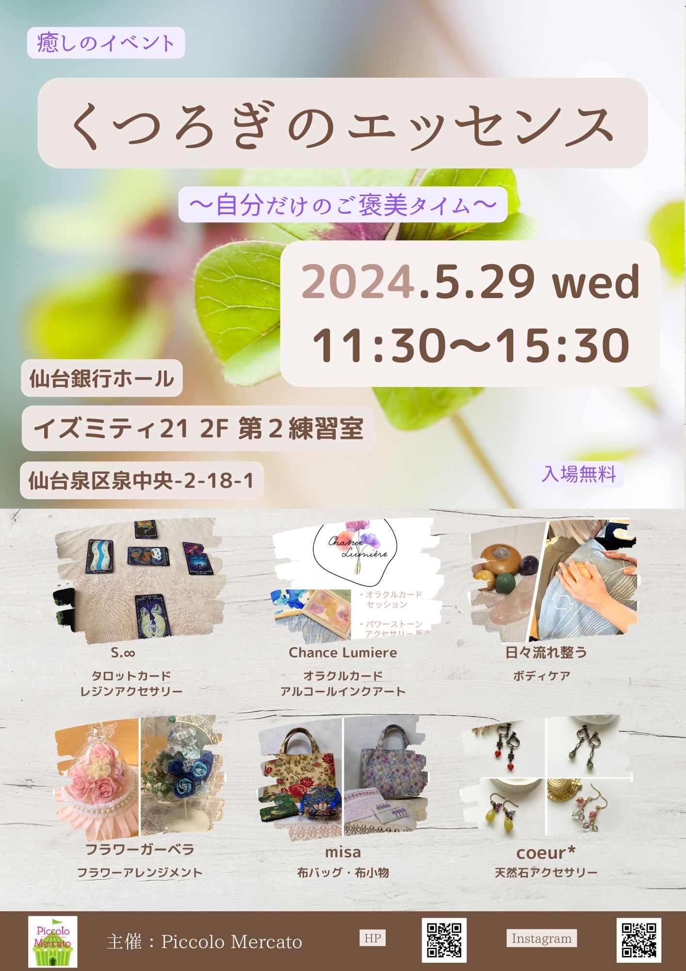 施術や占い・ハンドメイドの作品の販売などゆったりと過ごしていただけるプチマルシェです。
