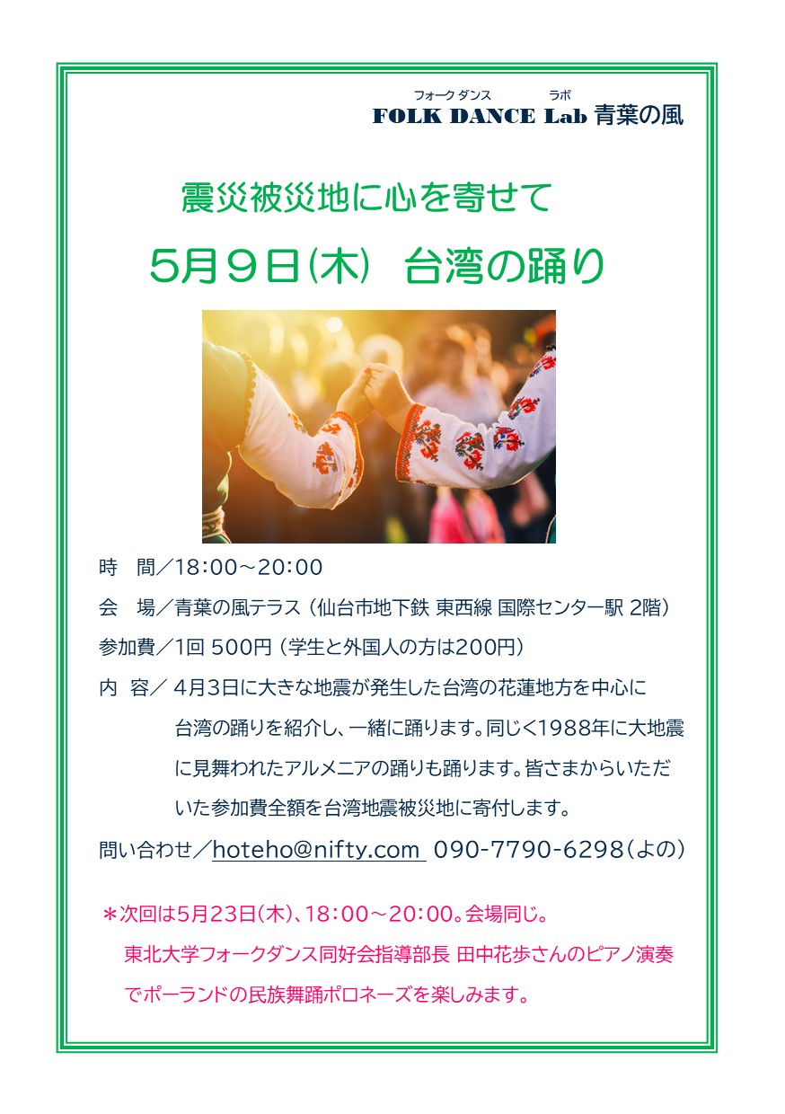 4月3日に大きな地震が発生した台湾の花蓮地方を中心に台湾の踊りを紹介し、一緒に踊ります。同じく1988年に大地震に見舞われたアルメニアの踊りも踊ります。皆さまからいただいた参加費全額を台湾地震被災地に寄付します。
