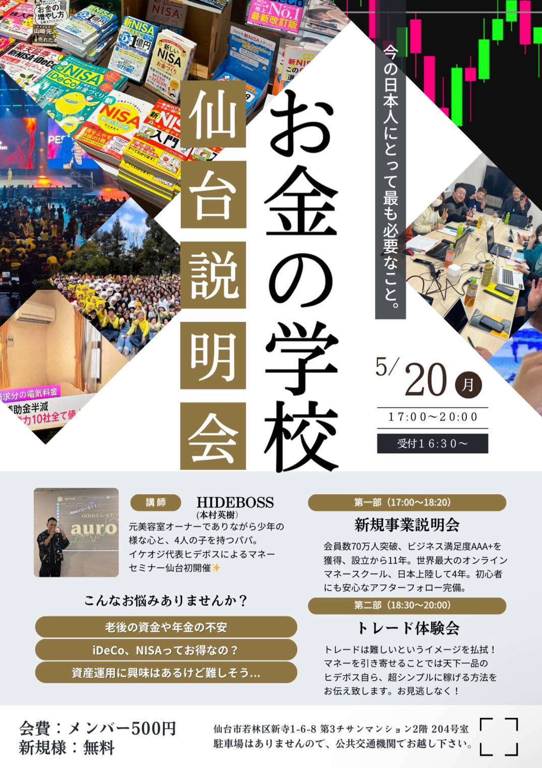 本セミナーでは、お金の学校について詳しく紹介するだけでなく、講師HIDSBOSS氏によるトレード体験会も行います。老後の資金や年金について不安がある方、iDeCoやNISAについて知りたい方、資産運用に興味があるけれど難しそうと感じている方など、お金に関する悩みを抱えている方におすすめです。