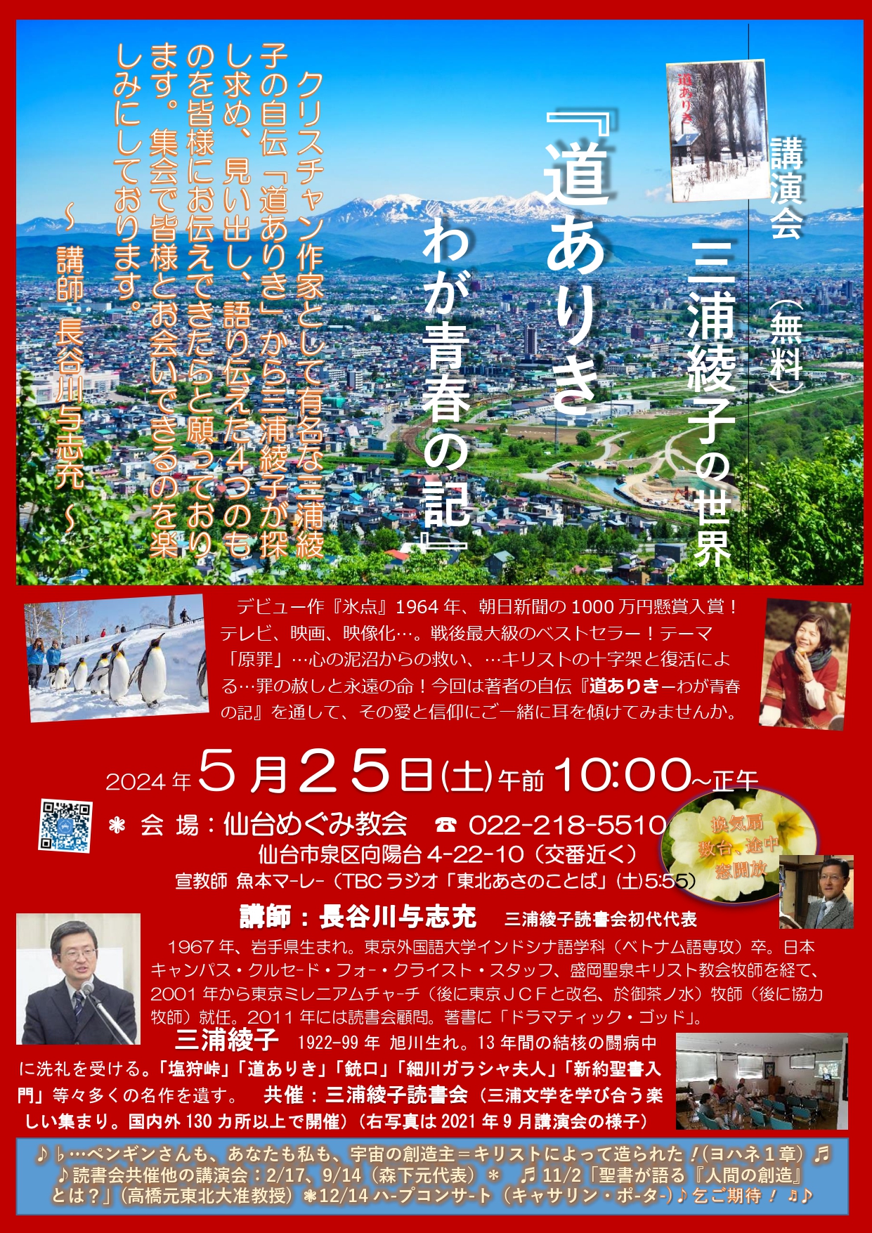 「クリスチャン作家として有名な三浦綾子の自伝『道ありき』から三浦綾子が探し求め、見い出し、語り伝えた4つのものを皆様にお伝えできたらと願っています。」講師 長谷川与志充氏(三浦綾子読書会初代会長)