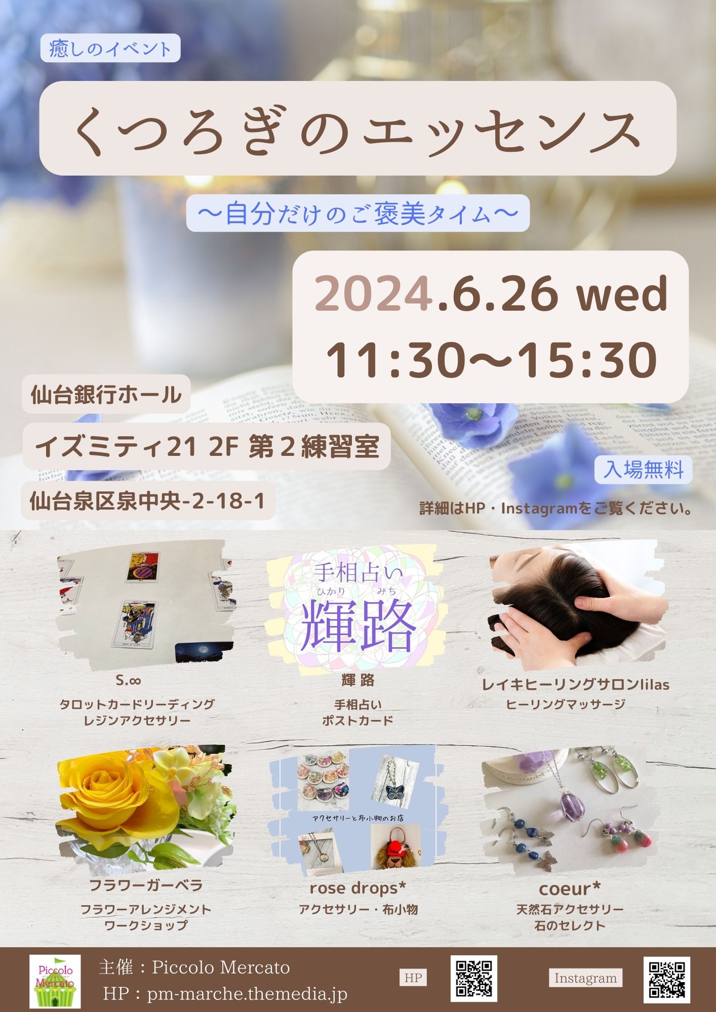 施術や占い・ハンドメイドの作品の販売などゆったりと過ごしていただけるプチマルシェです。