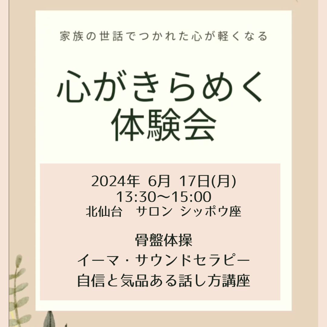 #きらめき体験会 #女性きらめきプロジェクト #女性応援 #イーマサウンドセラピー #子育て悩み #きれいな発音 #言語聴覚士 #講座 #ワークショップ #骨盤体操 #シッポウ座 #女性の居場所 #マダムハウス #mamaのおうち #チベット体操 #アロマ #仙台イベント #チャクラ #カラーセラピー #アロマセラピー #ヒーリング #算命学 #北仙台占い #北仙台