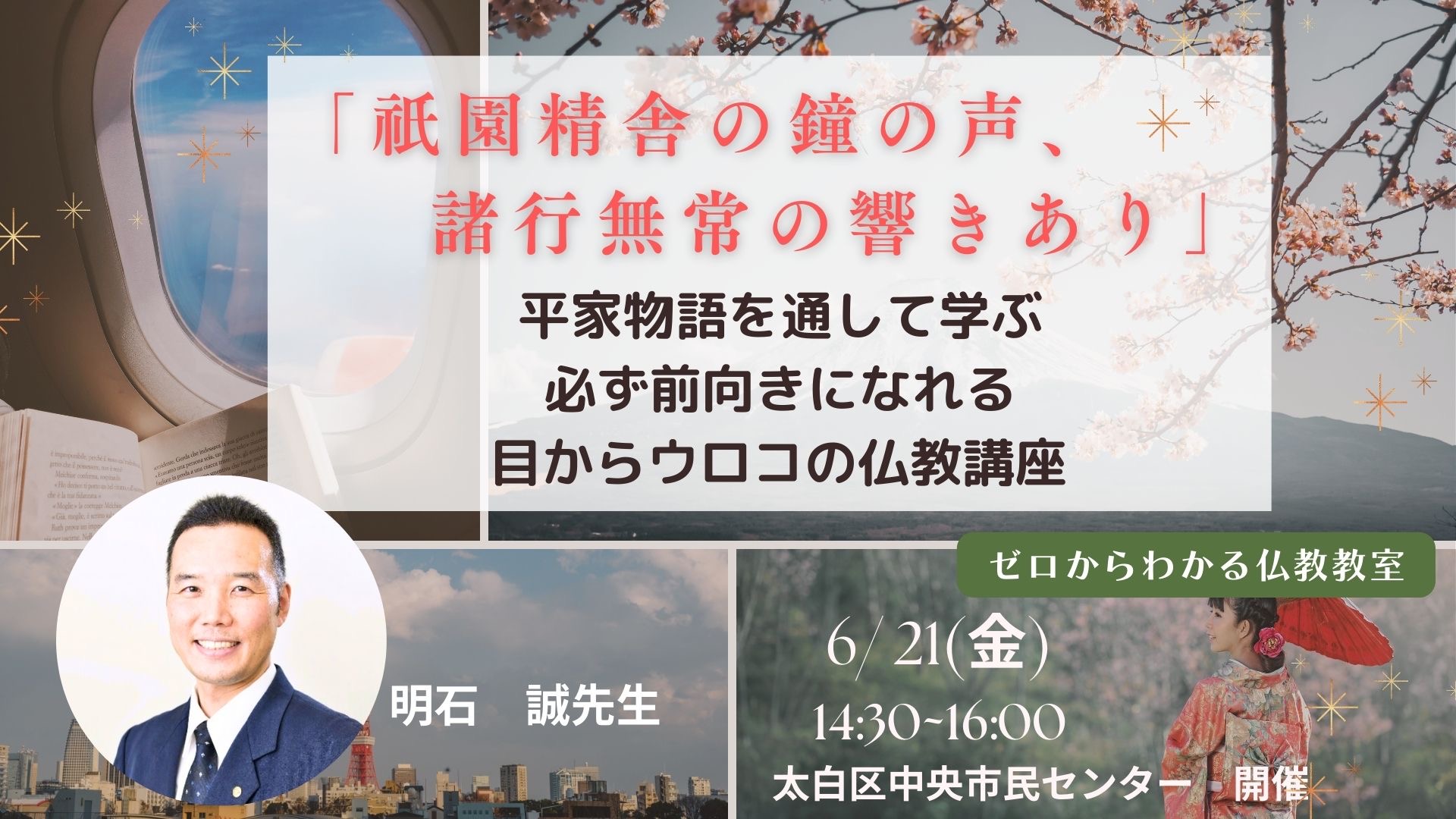 この平家物語の冒頭は、高校の授業で習った方も多いでしょう。「諸行」とは「この世のすべてのこと」、「無常」は「常がなく続かない」という意味です。やがて必ず壊れるものを一生懸命に求めるほど、悲しいことはありません。すべてが崩れる世の中で、私たちは何を求め、生きねばならないのか。最も大切なことがハッキリと知らされ、生きる元気が湧いてくる、必ず前向きになれる仏教講座です。