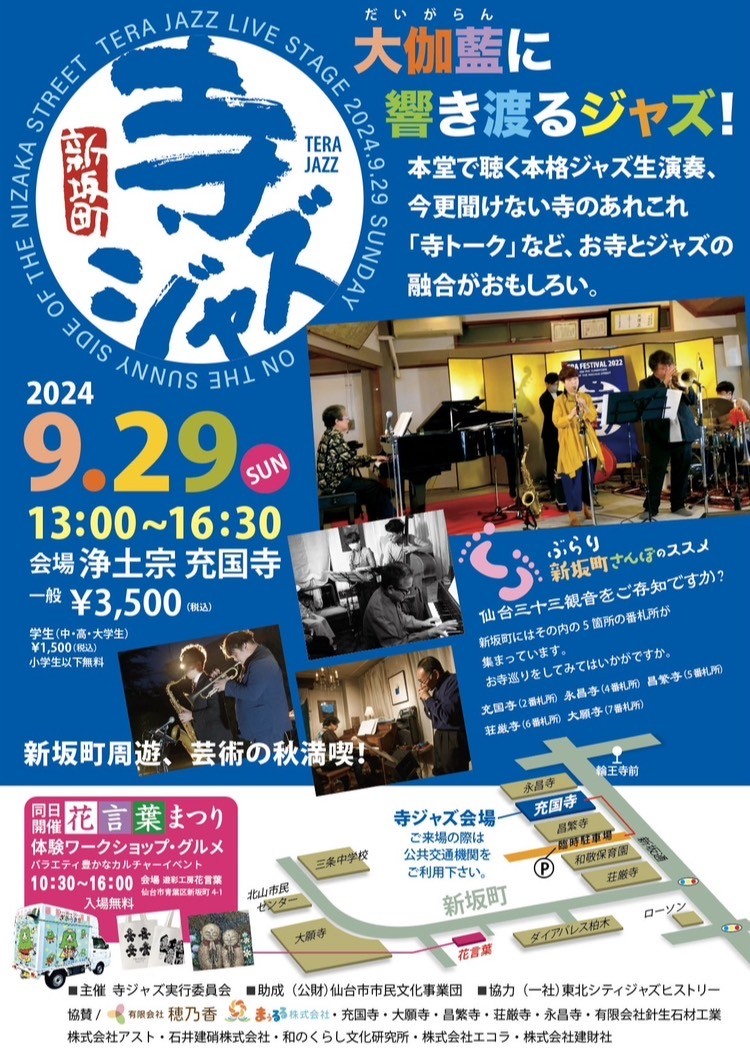 新坂町の充国寺を舞台に音楽イベントを開催して3回目。今回からタイトルを「新坂町 寺ジャズ」とし、ジャズに特化した内容でお届けします!