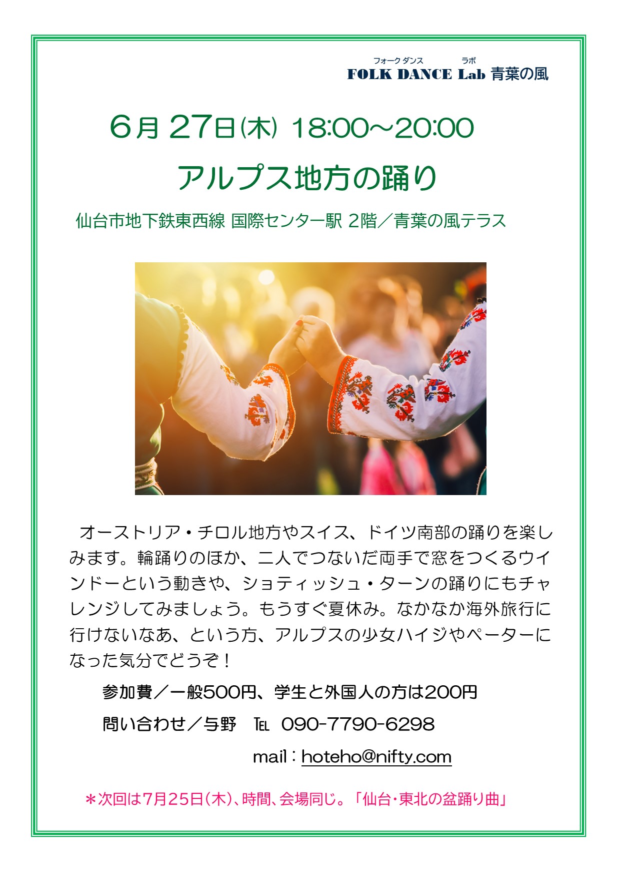 オーストリア・チロル地方やスイス、ドイツ南部の踊りを楽しみます。輪踊りのほか、二人でつないだ両手で窓をつくるウインドーという動きや、ショティッシュ・ターンの踊りにもチャレンジしてみましょう。もうすぐ夏休み。なかなか海外旅行に行けないなあ、という方、アルプスの少女ハイジやペーターになった気分でどうぞ!
