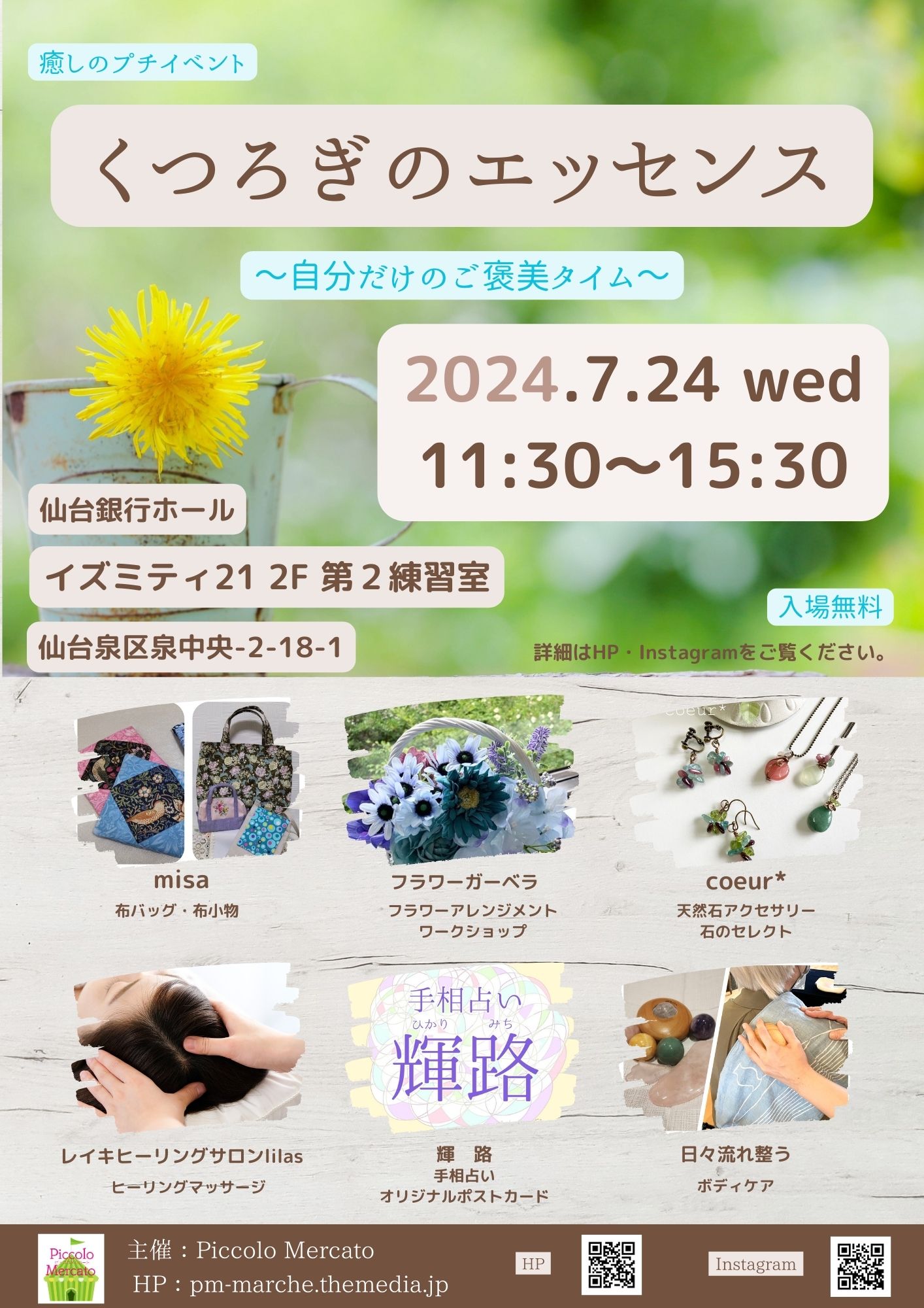 施術や占い・ハンドメイドの作品の販売などゆったりと過ごしていただける癒しのプチマルシェです。