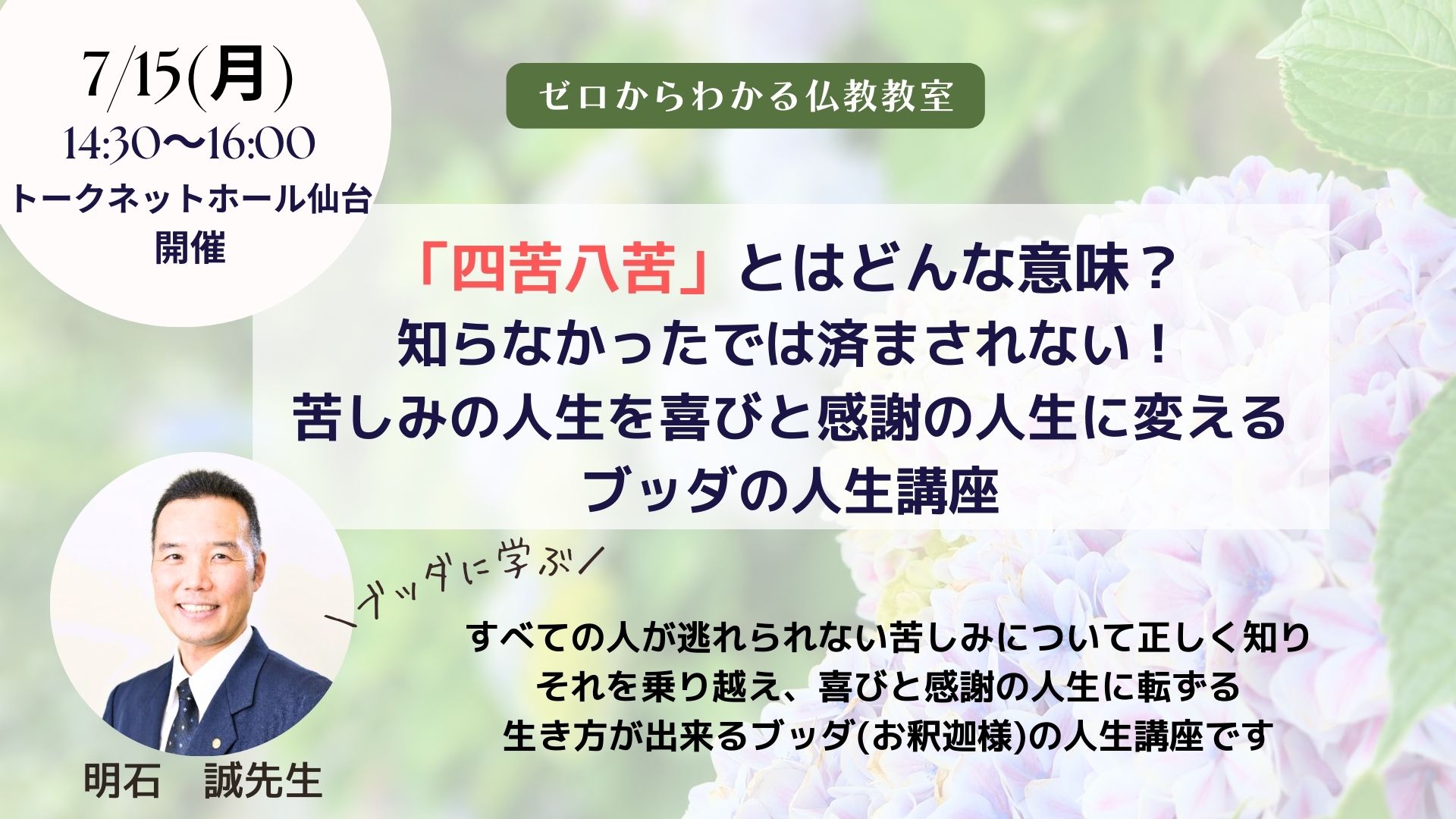 困った時に、「シクハック(四苦八苦)した」と言いますが、これは仏教から来た言葉です。人生の苦しみを、仏教では、、大きく4つに分け「四苦(しく)」と言います。それは、「生苦(しょうく)」「老苦(ろうく)」「病苦(びょうく)」「死苦(しく)」の4つです。さらに4つの苦しみを加え「八苦(はっく)」といいます。すべての人が逃れられない苦しみについて正しく知り、それを乗り越え、喜びと感謝の人生に転ずる生き方が出来るブッダ(お釈迦様)の人生講座です。
