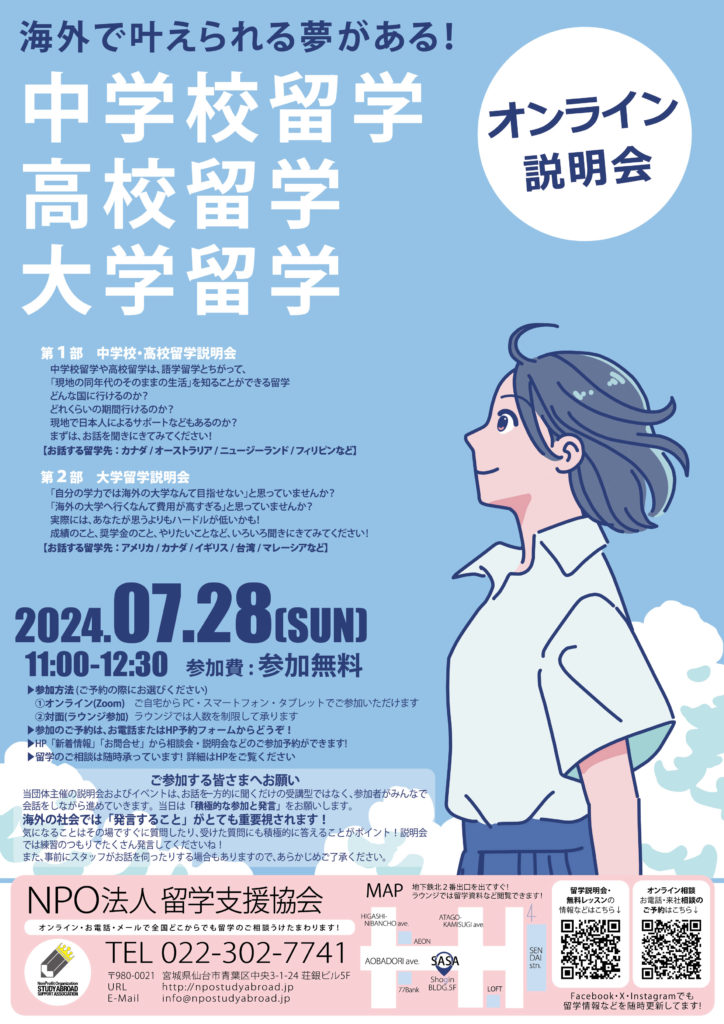 2024/07/28(日)「中学校留学」「高校留学」「大学留学」オンライン留学説明会
