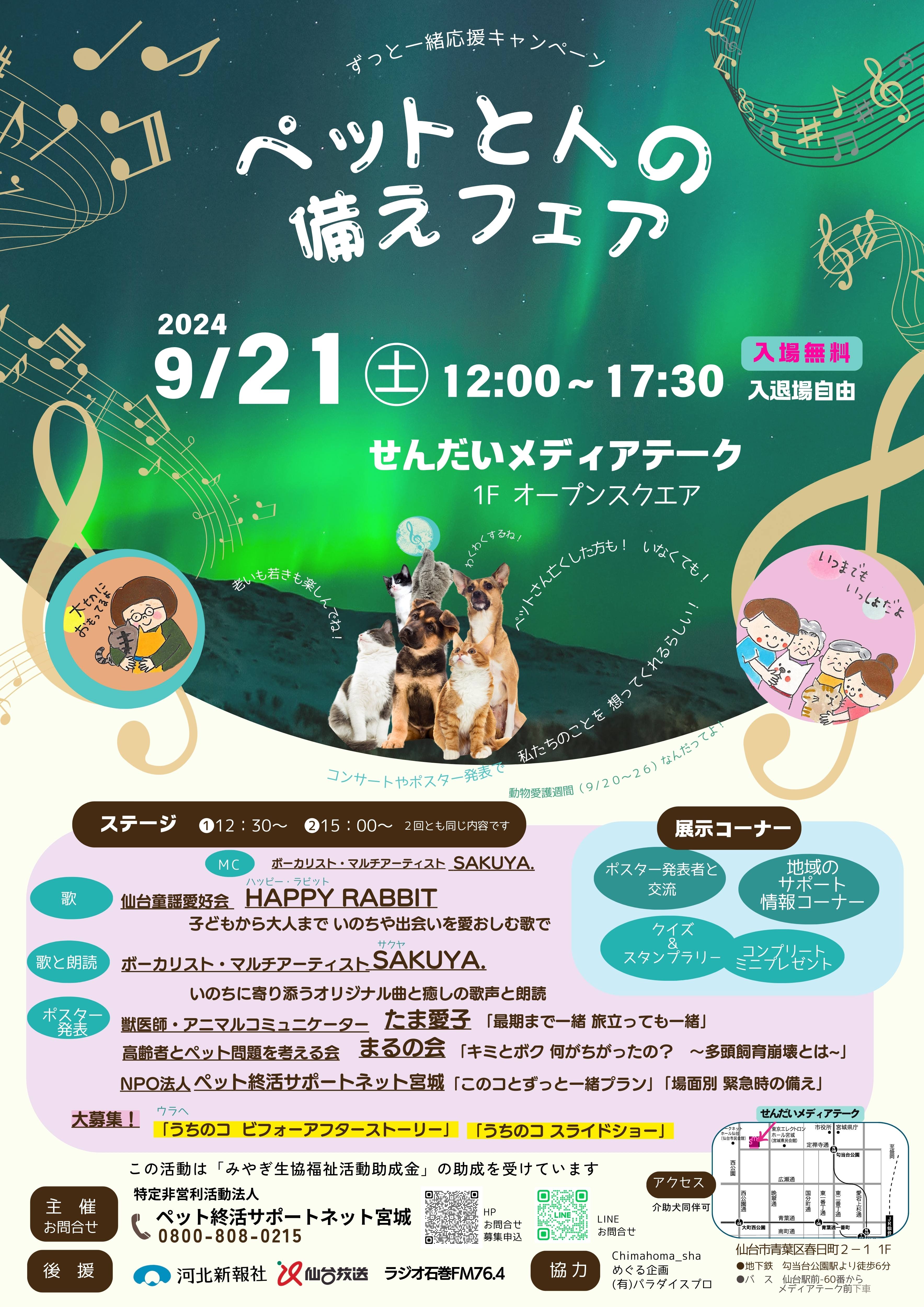 ペットと人のシニア期から亡くなるまで,ずっと一緒に幸せにいられるように,音楽や朗読,ポスター発表で味わってください。