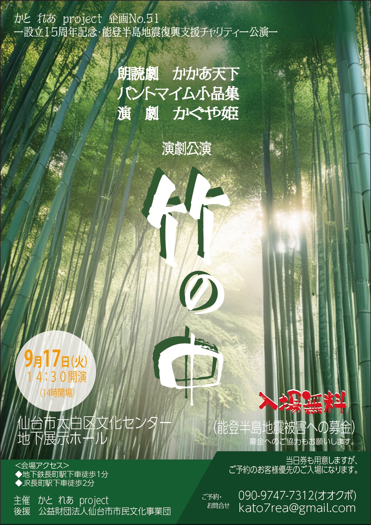 演劇公演「竹の中」には、落語話の朗読劇。素敵なパントマイム小品集。初演の演劇かぐや姫を活力のある役者たちとバージョンアップして創った作品をお楽しみください。
