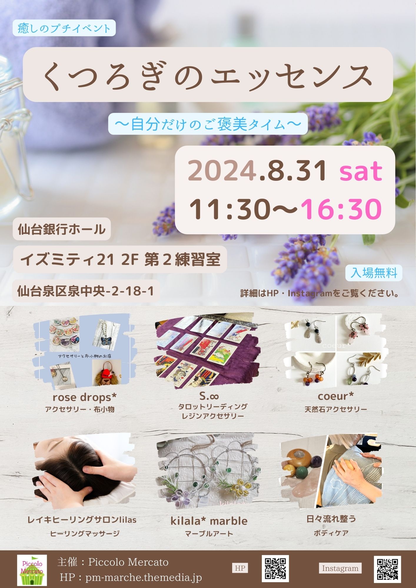 施術や占い・ハンドメイドの作品の販売などゆったりと過ごしていただける癒しのプチマルシェです。