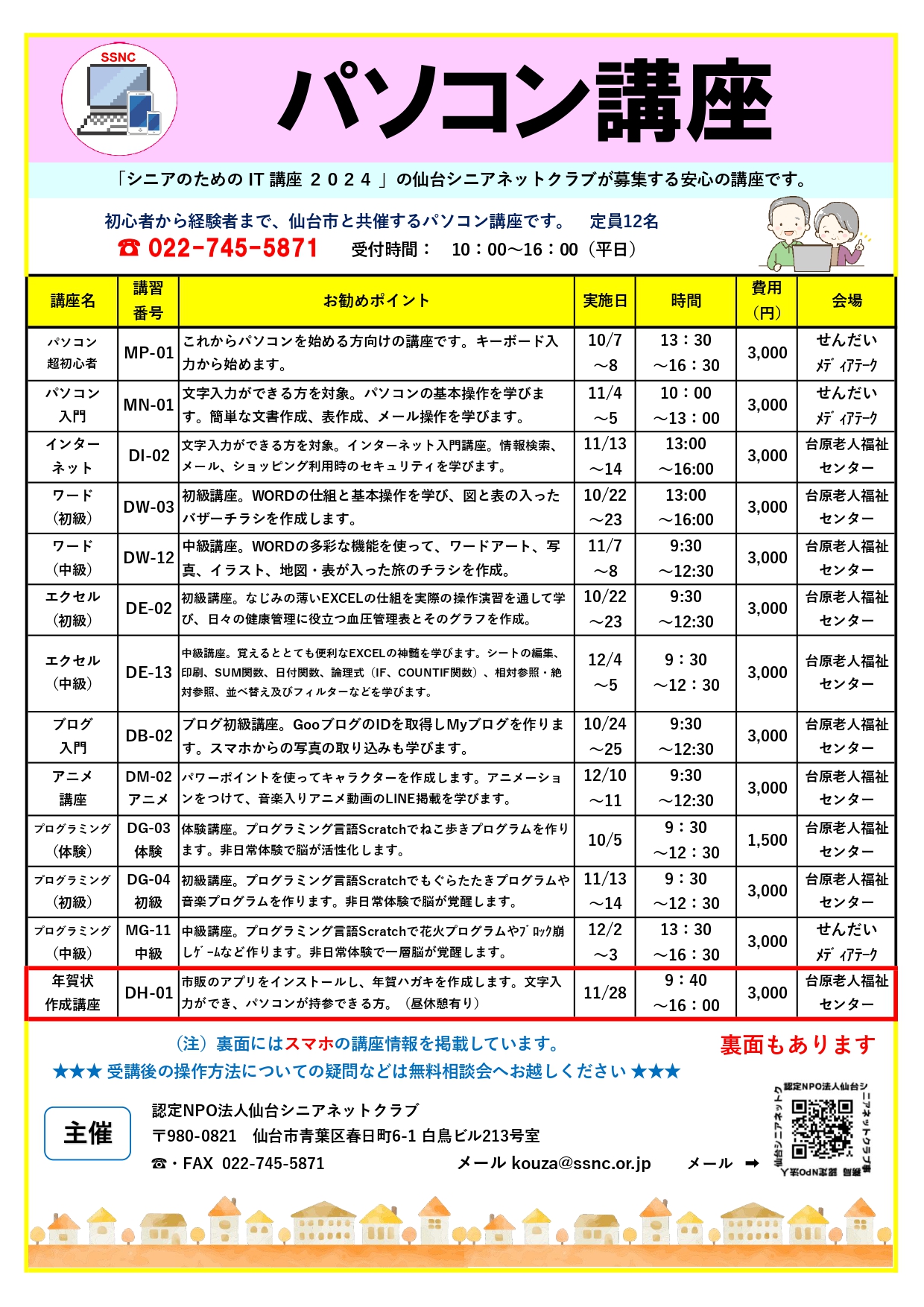 仙台市と共催する安心のパソコン講座です。
