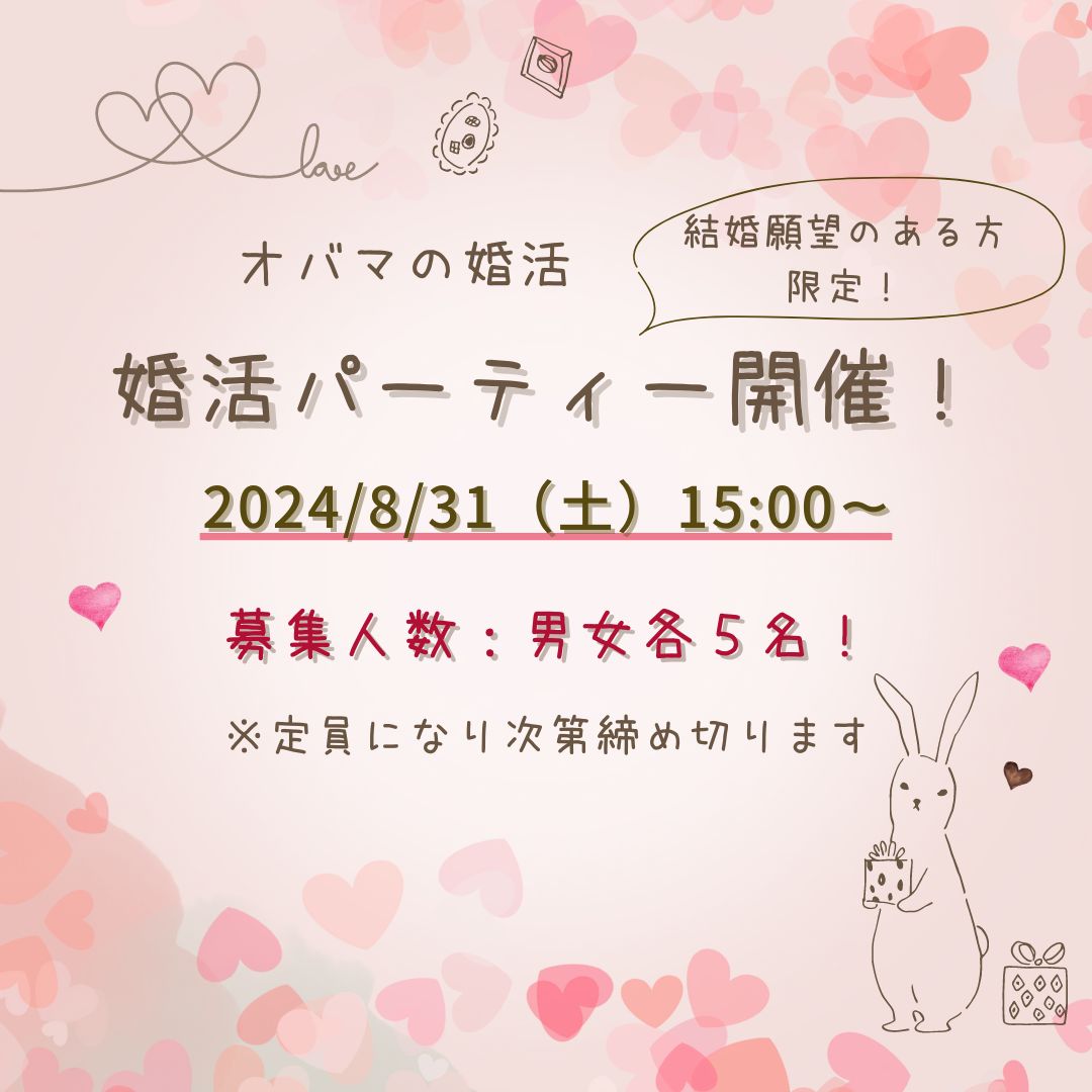 https://www.obama-konkatsu.com/event?utm_source=url&utm_medium=Pt&utm_campaign=event_2408ki2主催:オバマの婚活