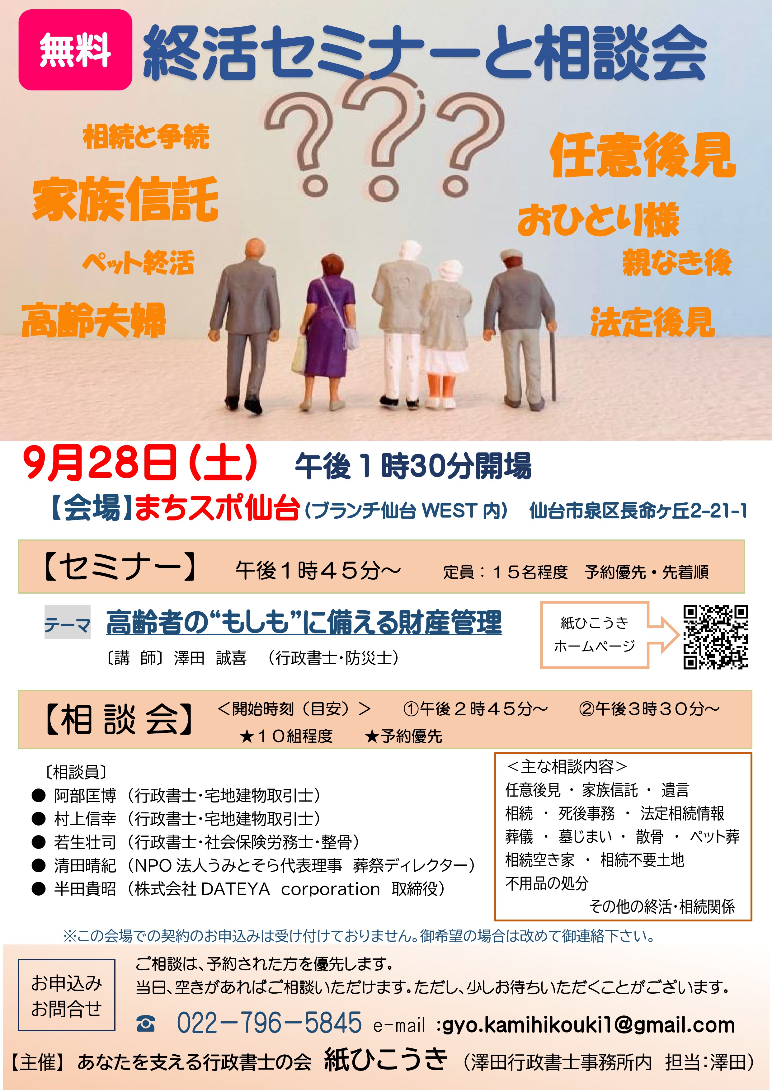 相談員には行政書士の他、葬祭やお墓(人だけでなくペットのお弔いも!)に詳しい清田氏や、不用品の処分について実績のある半田氏も参加いたします。