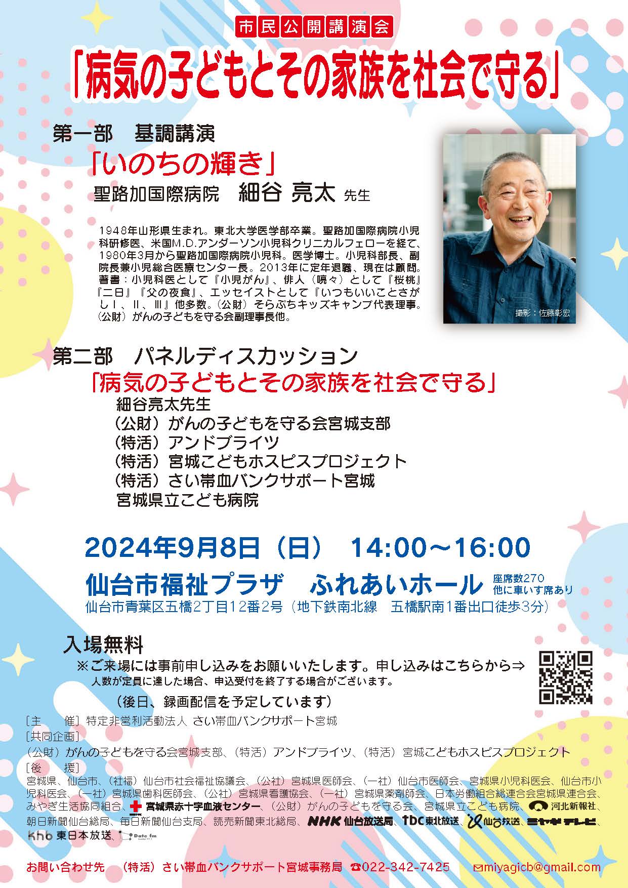 講演会では、小児医療の第一線でご活躍され、病気の子どもを支援するボランティア活動も長年続けられている聖路加国際病院の細谷亮太先生を講師にお招きして、基調講演をしていただきます。