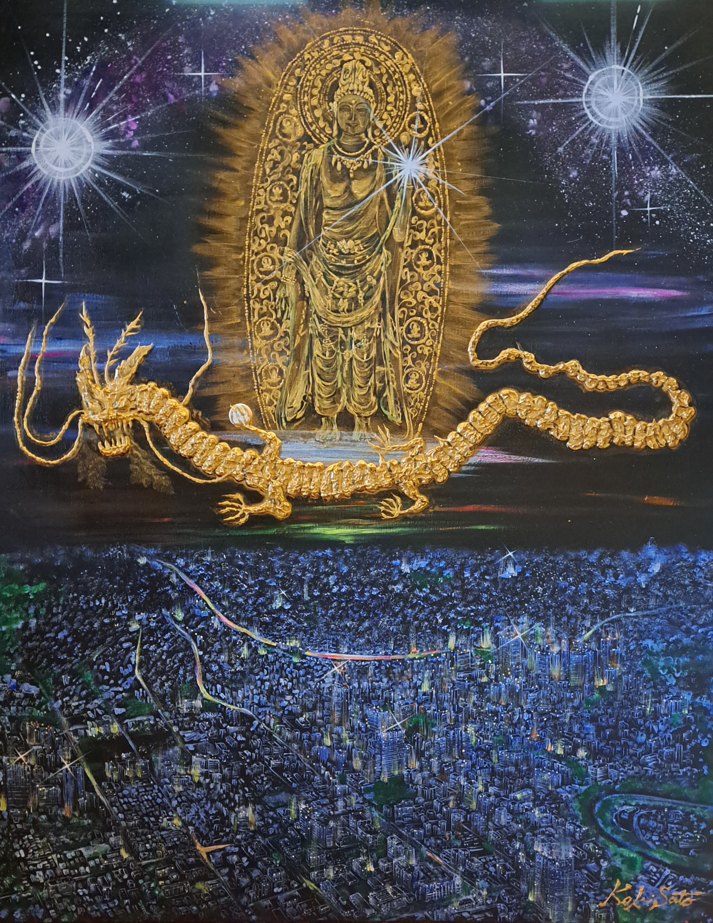 拝啓 残暑の候 、益々ご健勝のこととお喜び申し上げます。さて、このたび「佐藤皇季の私設ギャラリー」では開設9周年を迎えます。これもひとえに皆様方のご愛顧のおかげと感謝申し上げます。作品を鑑賞したい方、価格を知りたい方等大歓迎です。つきまして、9周年を記念して、ご来場の方に限定のポストカードのプレゼントをご用意してお待ち申し上げます。 是非とも、ホームページのお問い合わせ欄のメールアドレスより※ご予約必ず!お願い申し上げます。 打ち合わせのうえ予約の日にちが決まりましたら、お気軽にお越し願います。 敬具 駐車場OK、画像作品名「聖観音菩薩仙台降臨夜明け前」(某有名美術館作成のポスターカレンダー、2023年作パリ著名美術館など寄贈)作品をご覧いただけます。