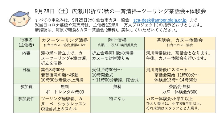 毎年9月最終土曜日は、広瀬川流域一斉清掃の日。仙台市カヌー協会は、折立会場を担当します。川から清掃する水上班、河原の整備清掃の陸上班。清掃後は、綺麗になった河原で軽食・茶話会です。