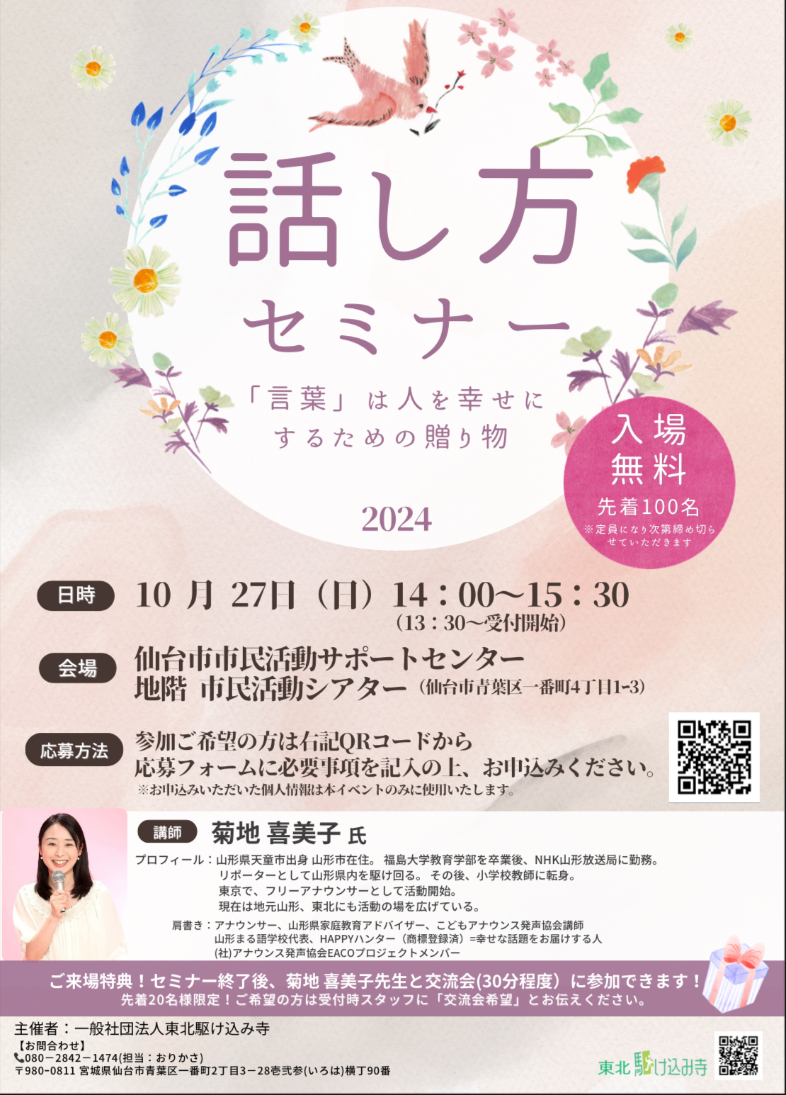 「言葉は人を幸せにするための贈り物」をテーマに話し方セミナーを開催します。講師はフリーアナウンサーの菊地喜美子さんです。