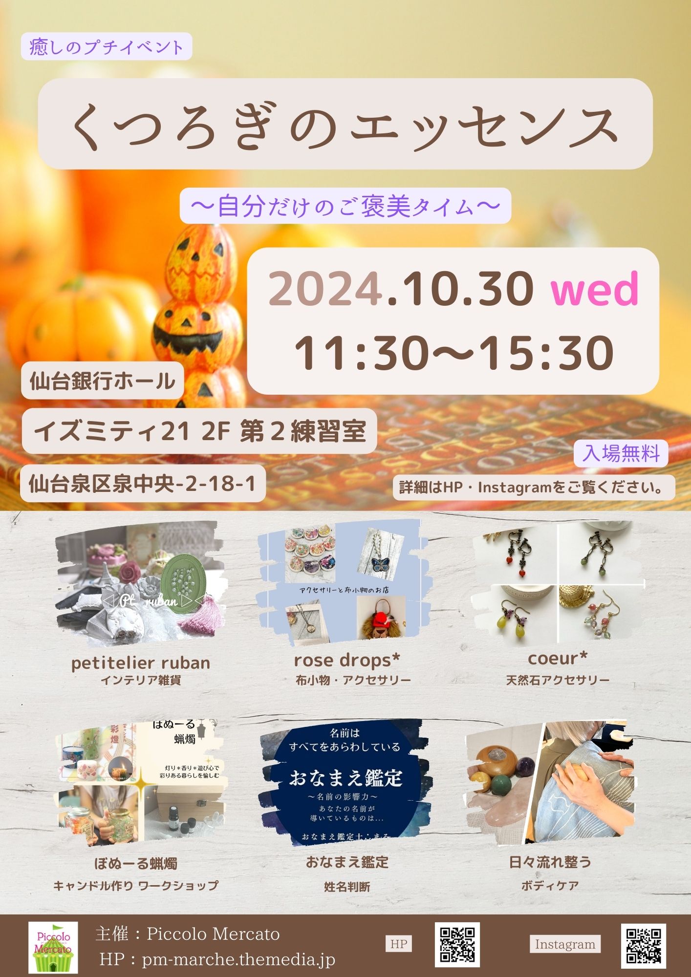 施術や占い・ハンドメイドの作品の販売などゆったりと過ごしていただける、癒しのプチマルシェです。